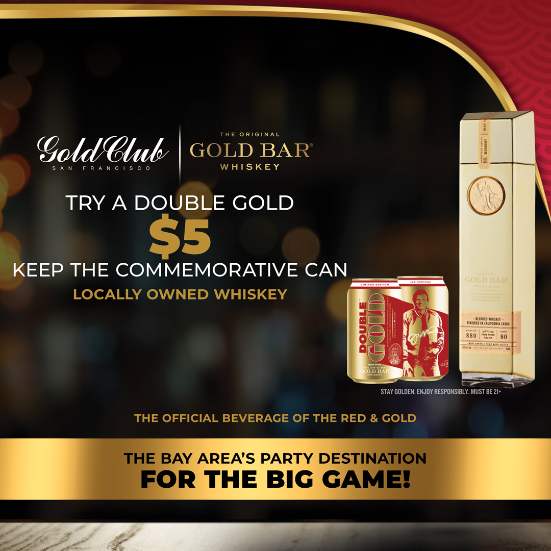 TRY A DOUBLE GOLD $5 KEEP THE COMMEMORATIVE CAN LOCALLY OWNED WHISKEY THE OFFICIAL BEVERAGE OF THE RED & GOLD GOLD CLUB + GOLD BAR THE BAY AREA’S PARTY DESTINATION FOR THE BIG GAME! STAY GOLDEN.